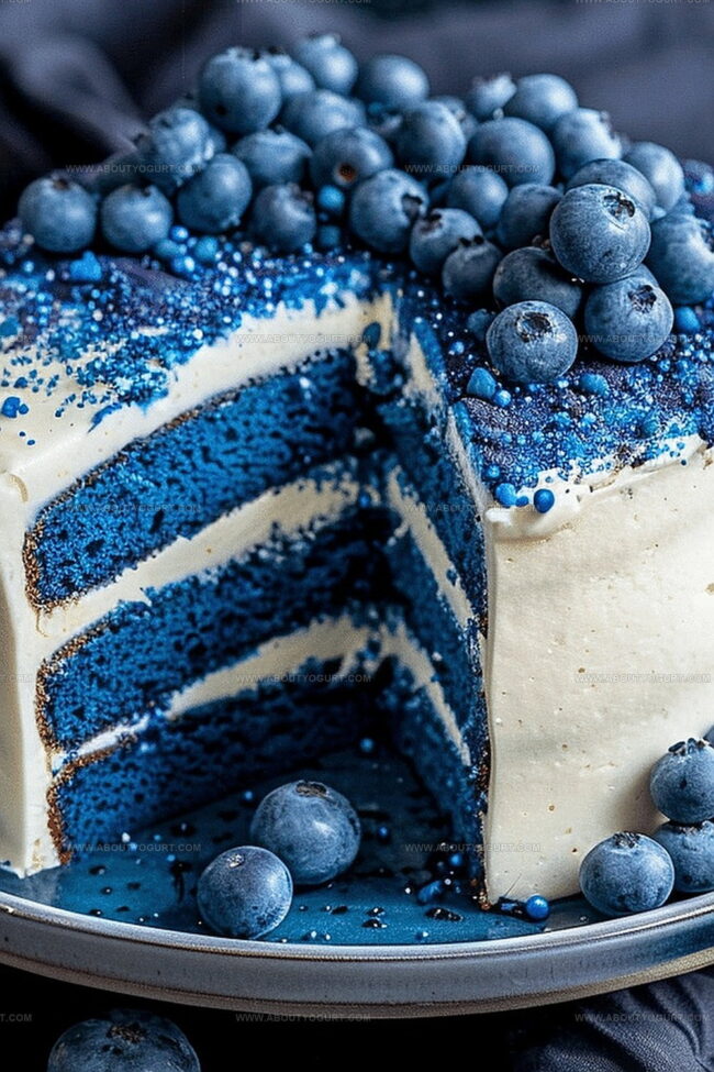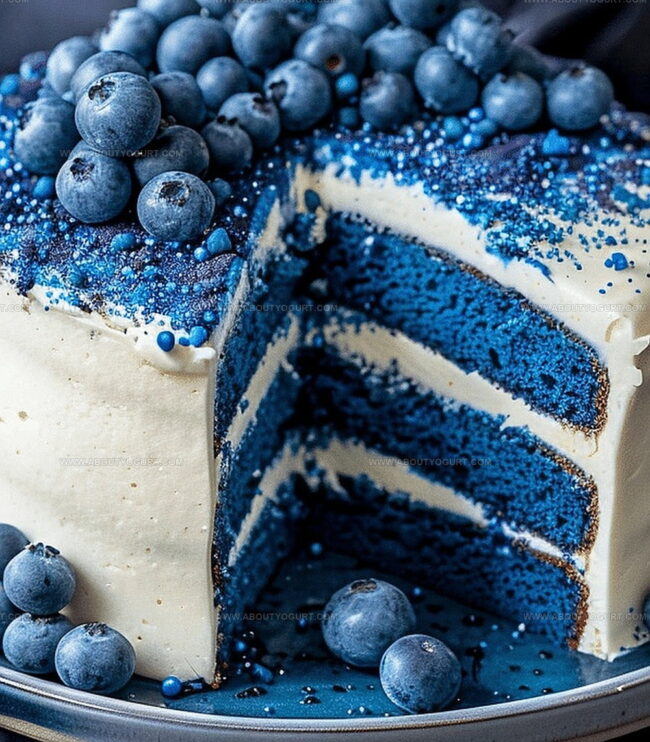 The cake’s vibrant blue shade comes from a strategic mix of blue and violet food coloring, carefully combined to create a rich, deep blue tone.