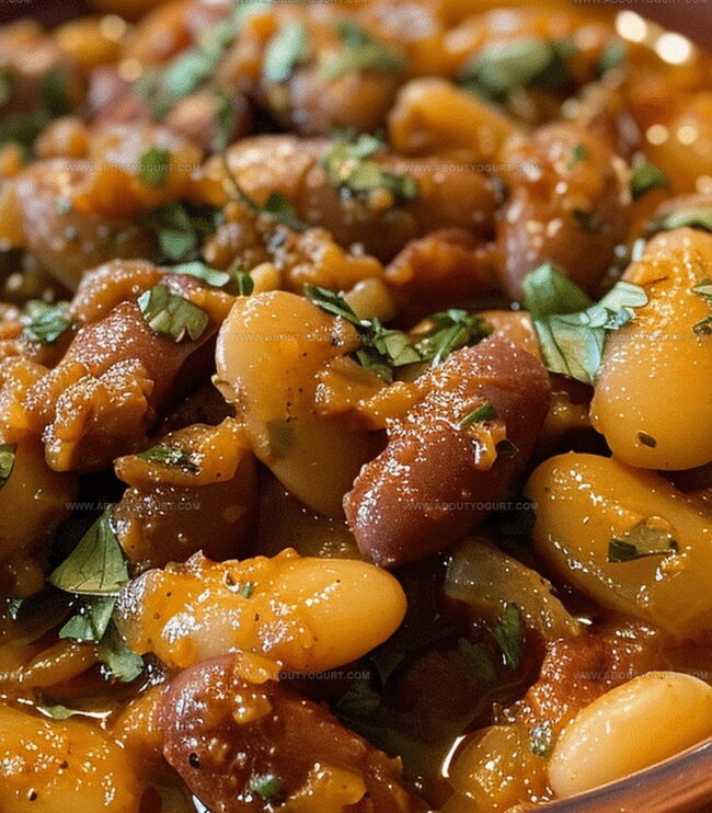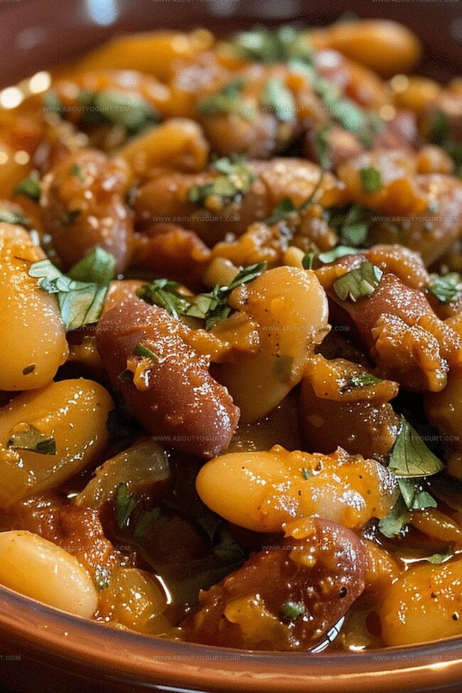 Add the cooked meats and sautéed vegetables into the bean pot. Stir in:Step 5: Simmer and Develop Depth