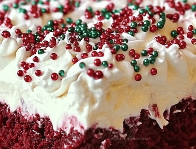 Festive Christmas red velvet poke cake brings holiday magic to dessert tables with its rich crimson layers and creamy filling. Spirited cream cheese frosting and delicate holiday sprinkles complete this merry seasonal treat you’ll want to share with loved ones.