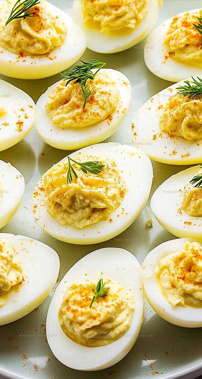 - Enhance the visual appeal and flavor by dusting the filled eggs with a light sprinkle of paprika and delicately garnishing with fresh dill or chopped chives.