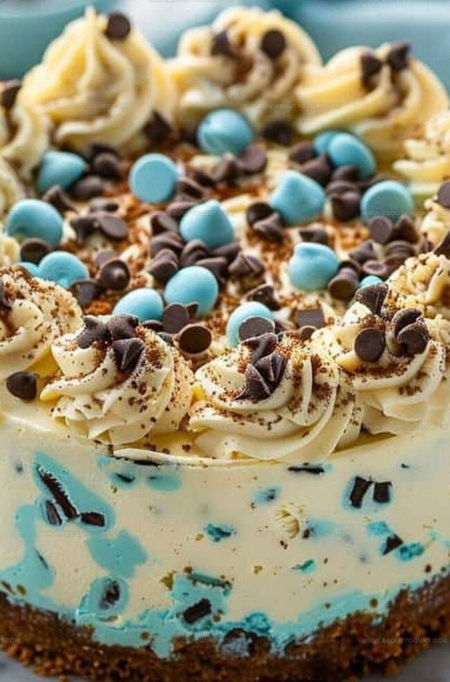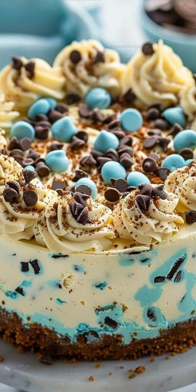 Dive into cookie monster magic with this playful cheesecake that brings childhood nostalgia to dessert tables. Blue-swirled creamy cheesecake studded with chocolate chip cookies promises pure delight for sweet seekers craving whimsical indulgence.
