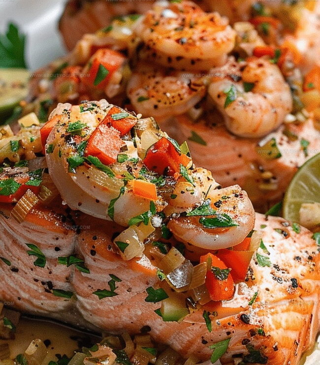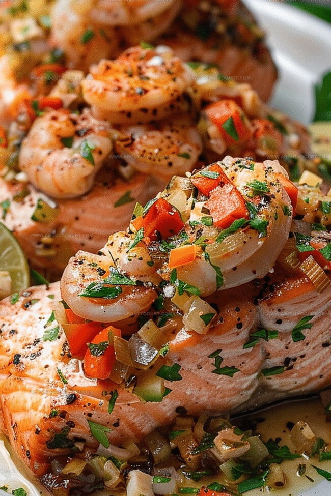 Succulent shrimp and crab nestled within flaky salmon create an unforgettable dining experience.