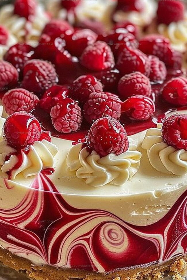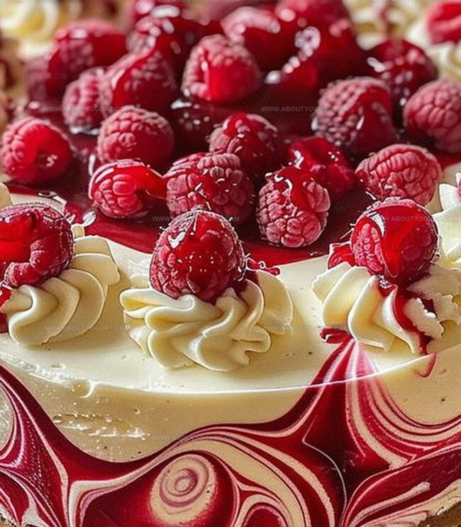 Delicate raspberries dance through smooth cream cheese layers, creating a mesmerizing visual masterpiece.