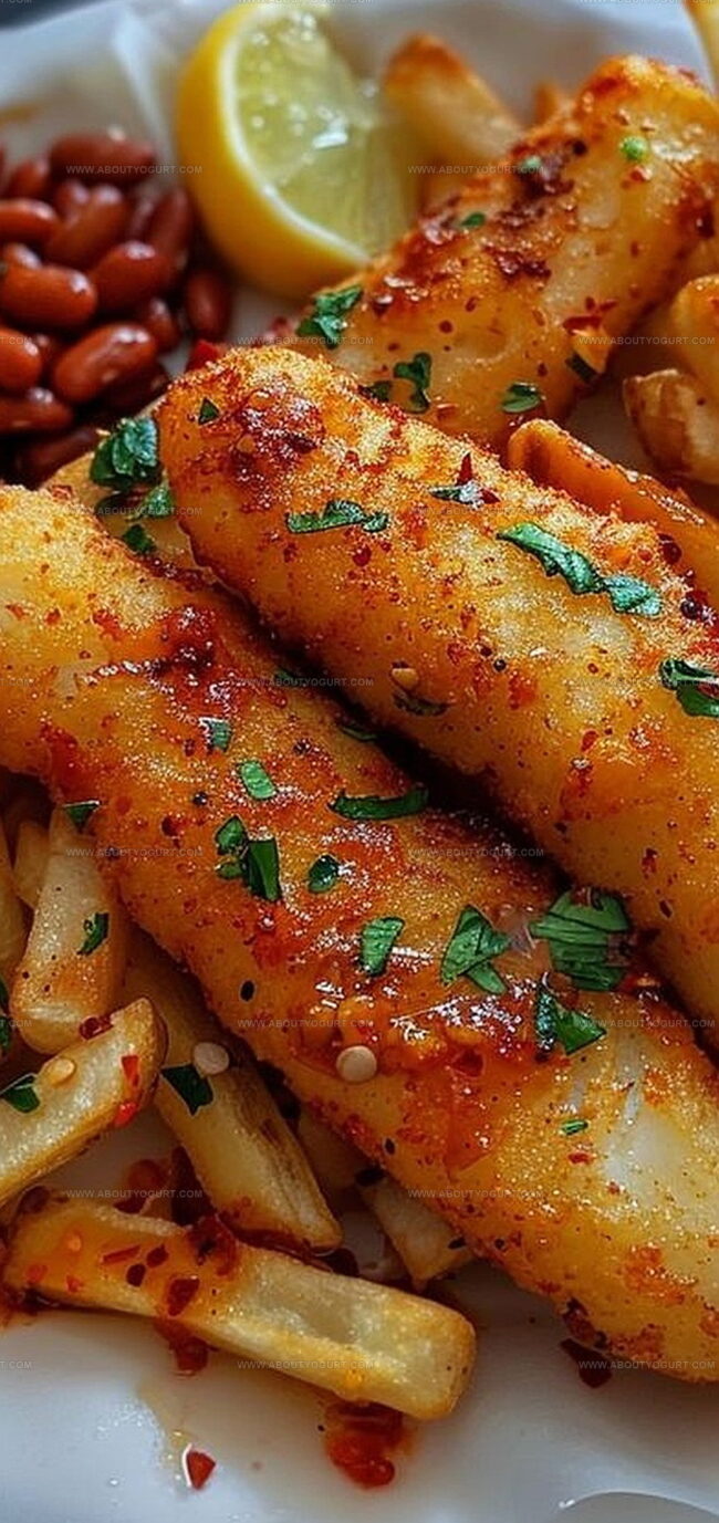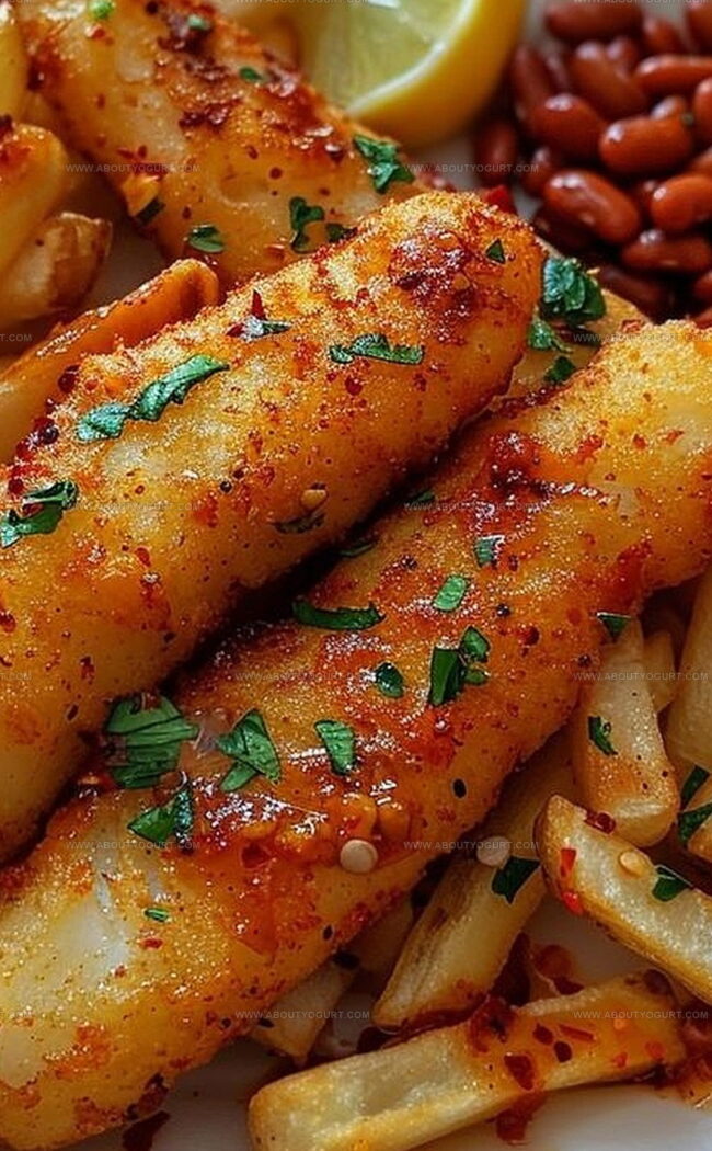 Crispy fish fingers dance with zesty peri peri fries, creating a mouthwatering plate that promises serious flavor excitement.