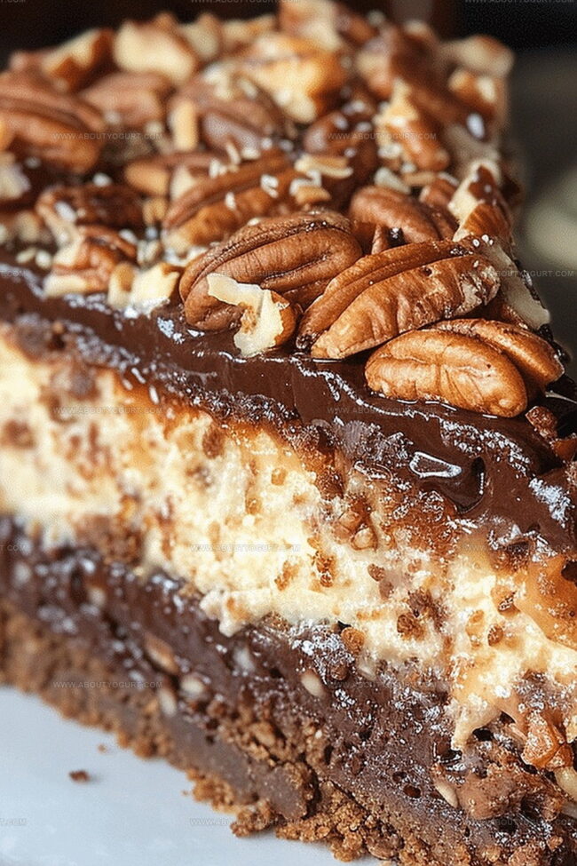 The combination of smooth cream cheese filling with rich chocolate and the crunchy coconut-pecan topping creates a complex, layered texture that’s both creamy and crisp.