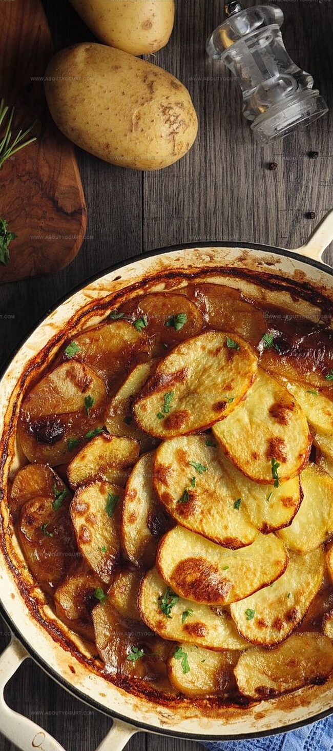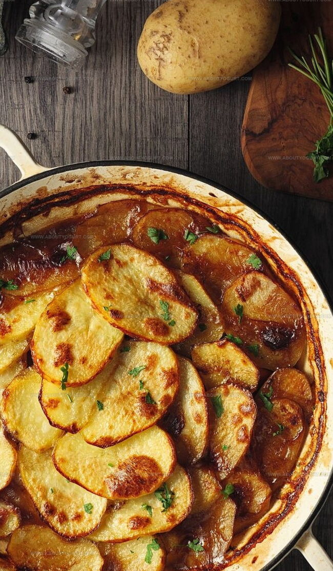 - Arrange thinly sliced potatoes in an overlapping layer across the top of the meat, creating a beautiful protective crust.