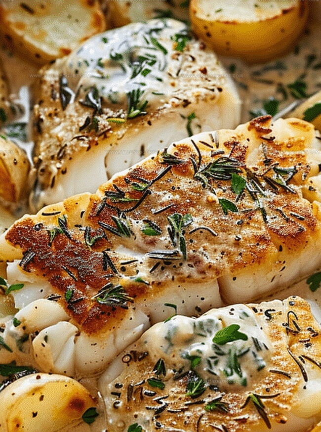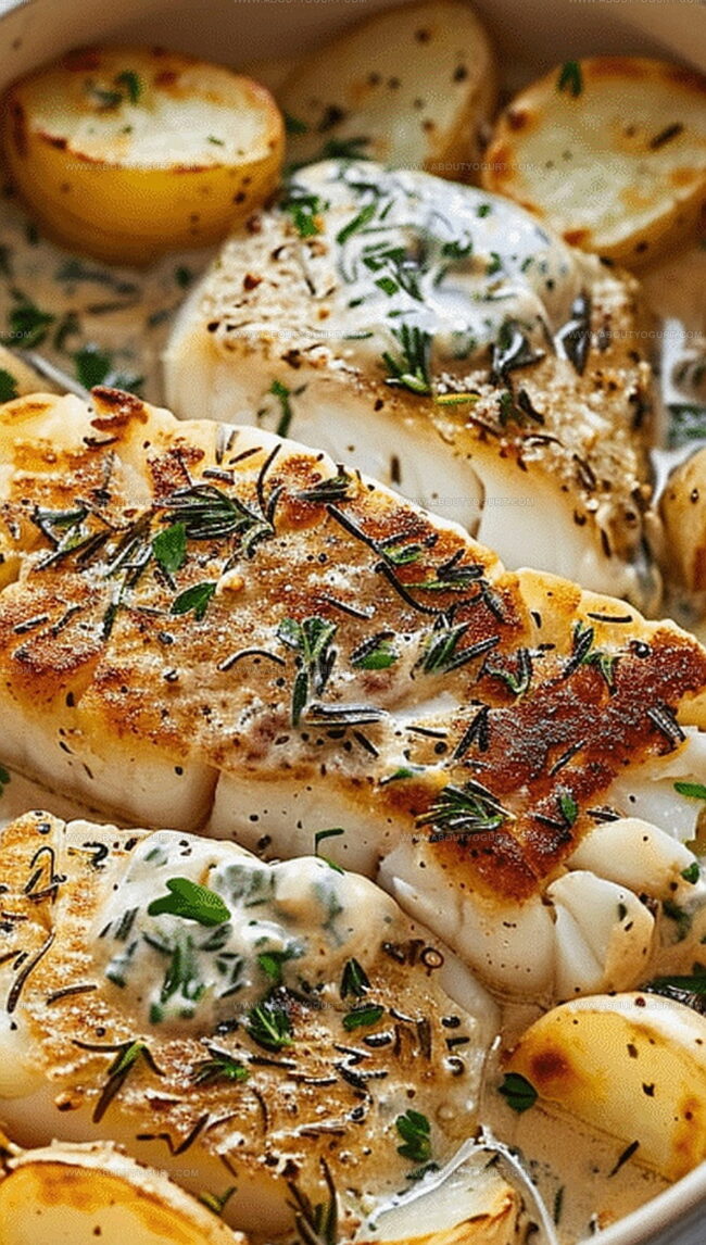 - Season cod with remaining salt and arrange on top of roasted potatoes in the prepared baking dish. Drizzle the herbed cream sauce over the fish.