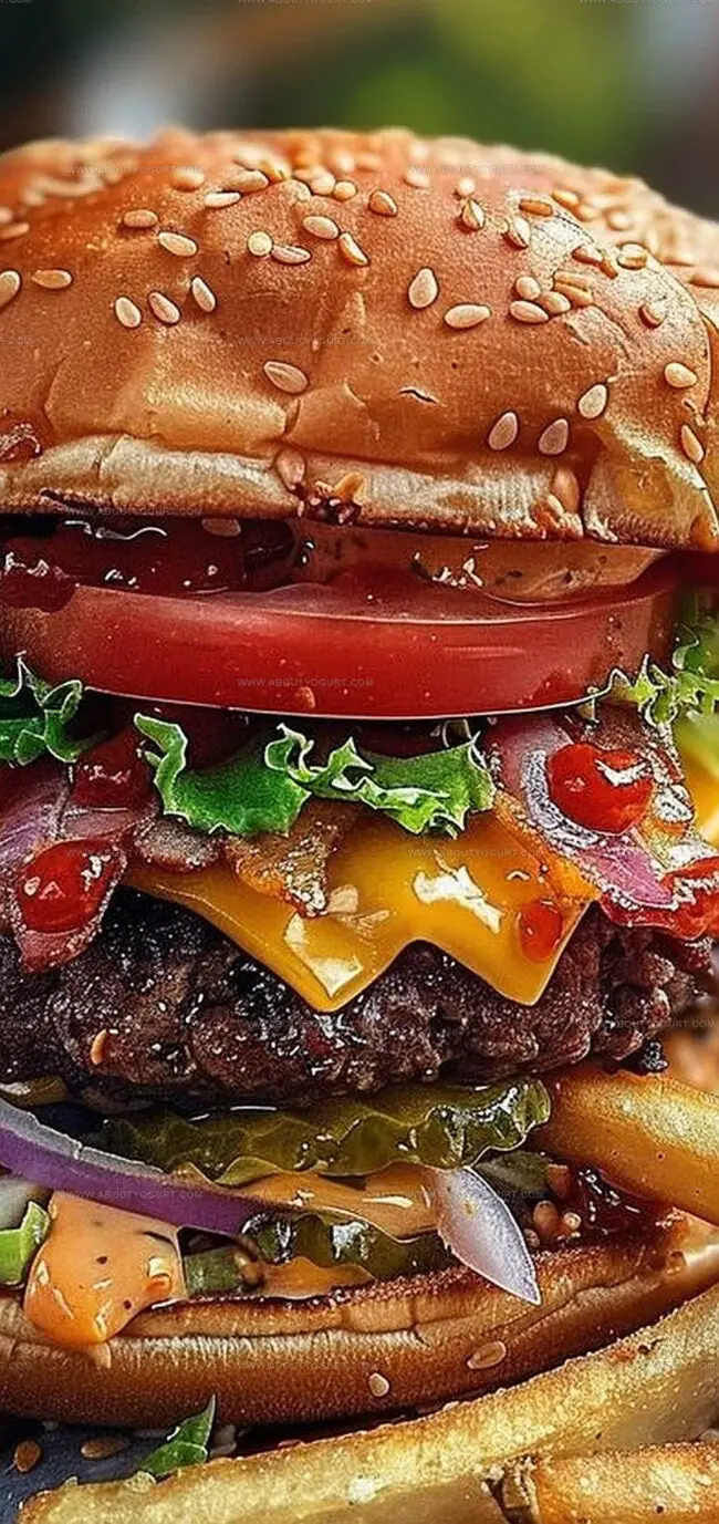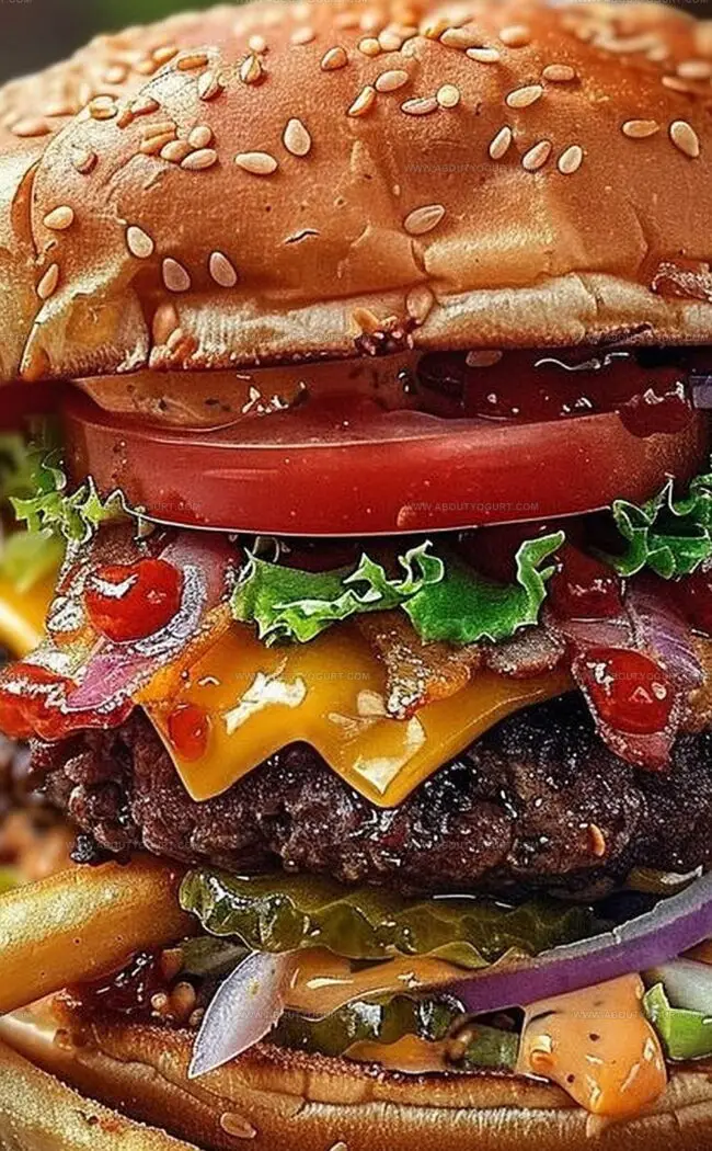 Layers of toppings like crisp bacon bits, tangy pickles, and creamy special sauce add irresistible complexity to this indulgent meal.
