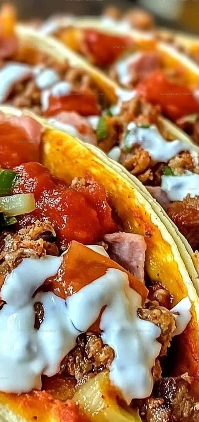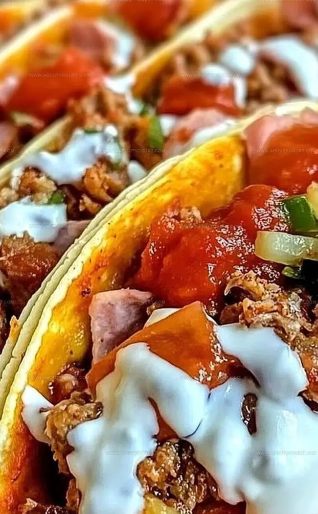 Savory meat lovers pizza tacos combine classic Italian and Mexican flavors in one delicious handheld delight. Melted cheese, spicy pepperoni, and seasoned ground beef create a mouthwatering fusion that satisfies cravings and brings excitement to your dinner table.