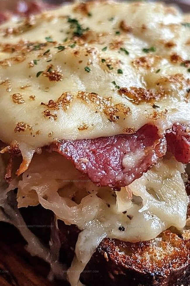 Culinary magic happens when classic Reuben sandwich meets creative open-faced style, blending hearty corned beef with tangy sauerkraut and melted swiss. Layers of flavor dance between crisp rye bread, promising a delicious journey through traditional deli comfort you’ll savor to the last bite.