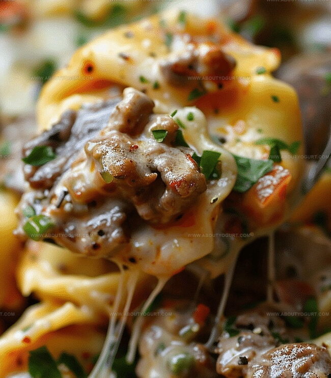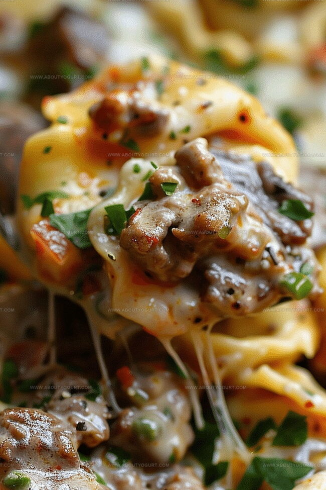 Creamy Philly Cheesesteak Tortellini Pasta blends classic sandwich flavors with comforting pasta perfection. Rich beef, melted provolone, and tender tortellini create a hearty meal that satisfies your deepest comfort food cravings.