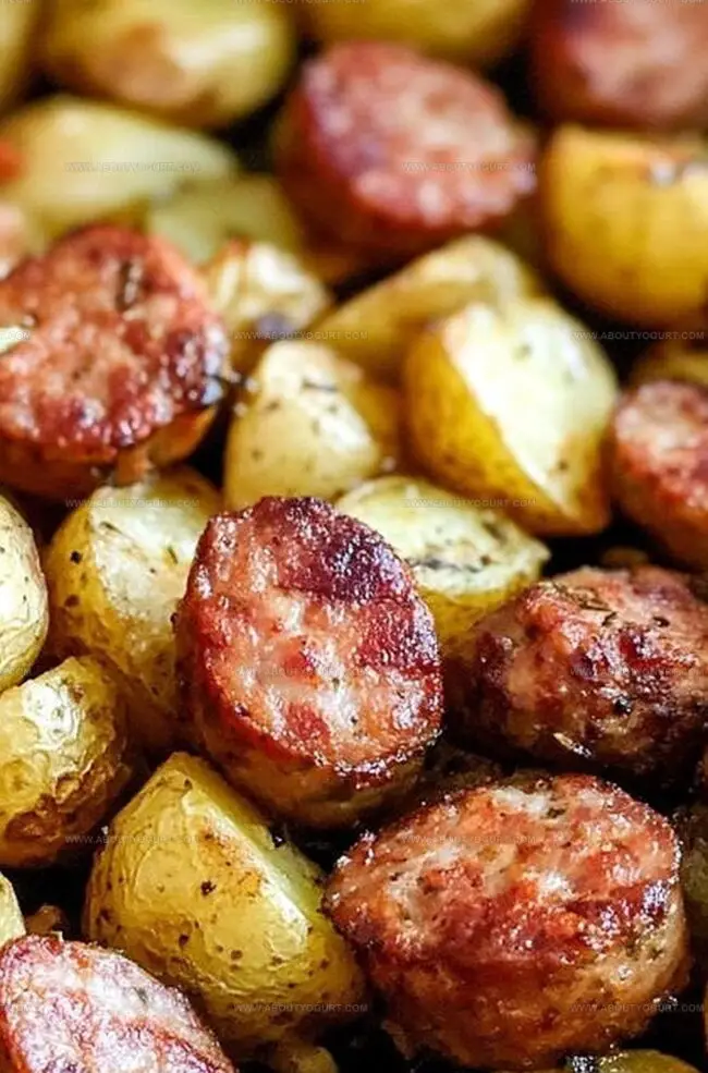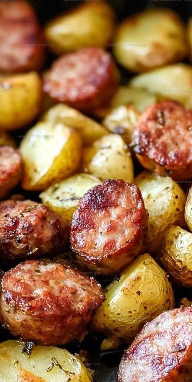 Juicy sausage links nestle perfectly alongside golden potato chunks, creating a hearty combination that screams comfort.