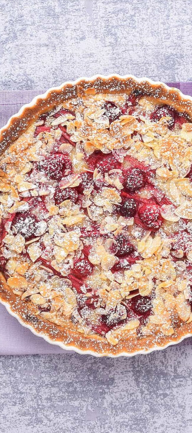 Almond-rich pastry cream nestles beneath vibrant ruby fruits in this elegant dessert.
