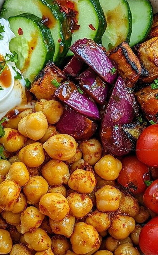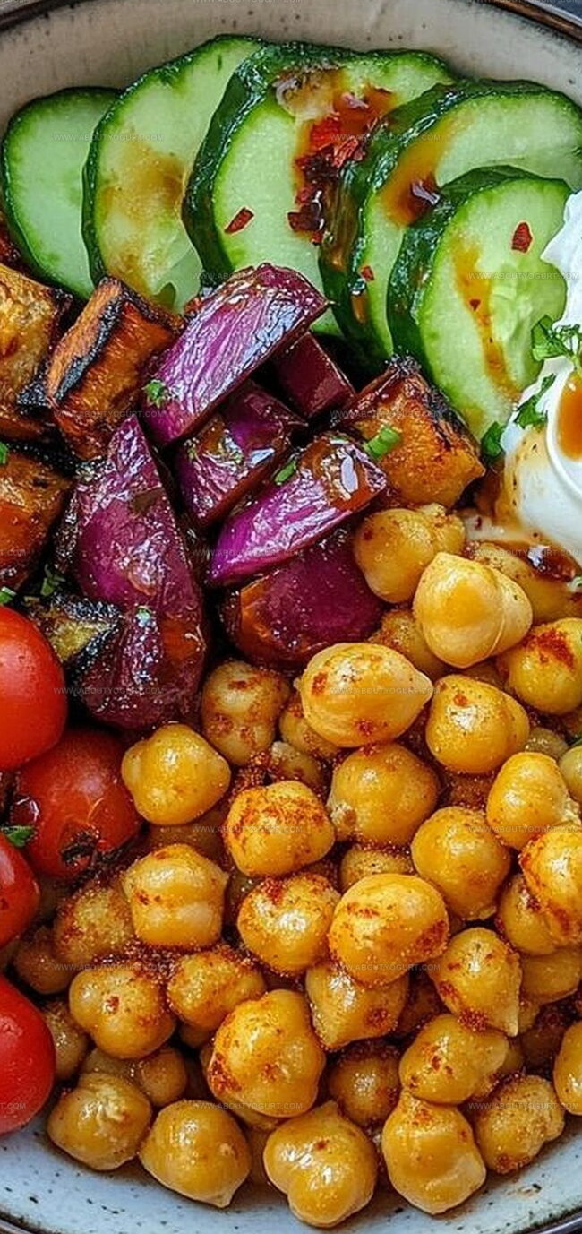 Mediterranean-inspired roasted chickpea & veggie bowl blends wholesome ingredients with zesty spices for a nourishing meal. Crisp vegetables, golden chickpeas, and tangy herb dressing create a delightful plate that satisfies hunger and delights senses.