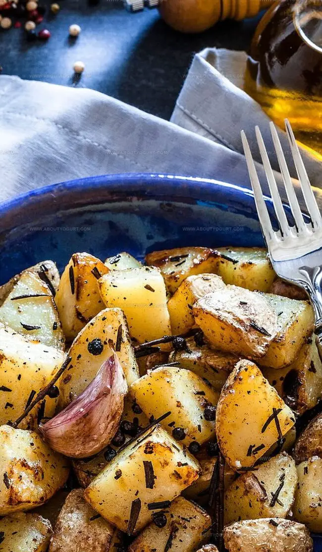 - Generously coat potato cubes with aromatic oil, complementing with fragrant herbs, zesty garlic powder, smoky paprika, and balanced seasoning.